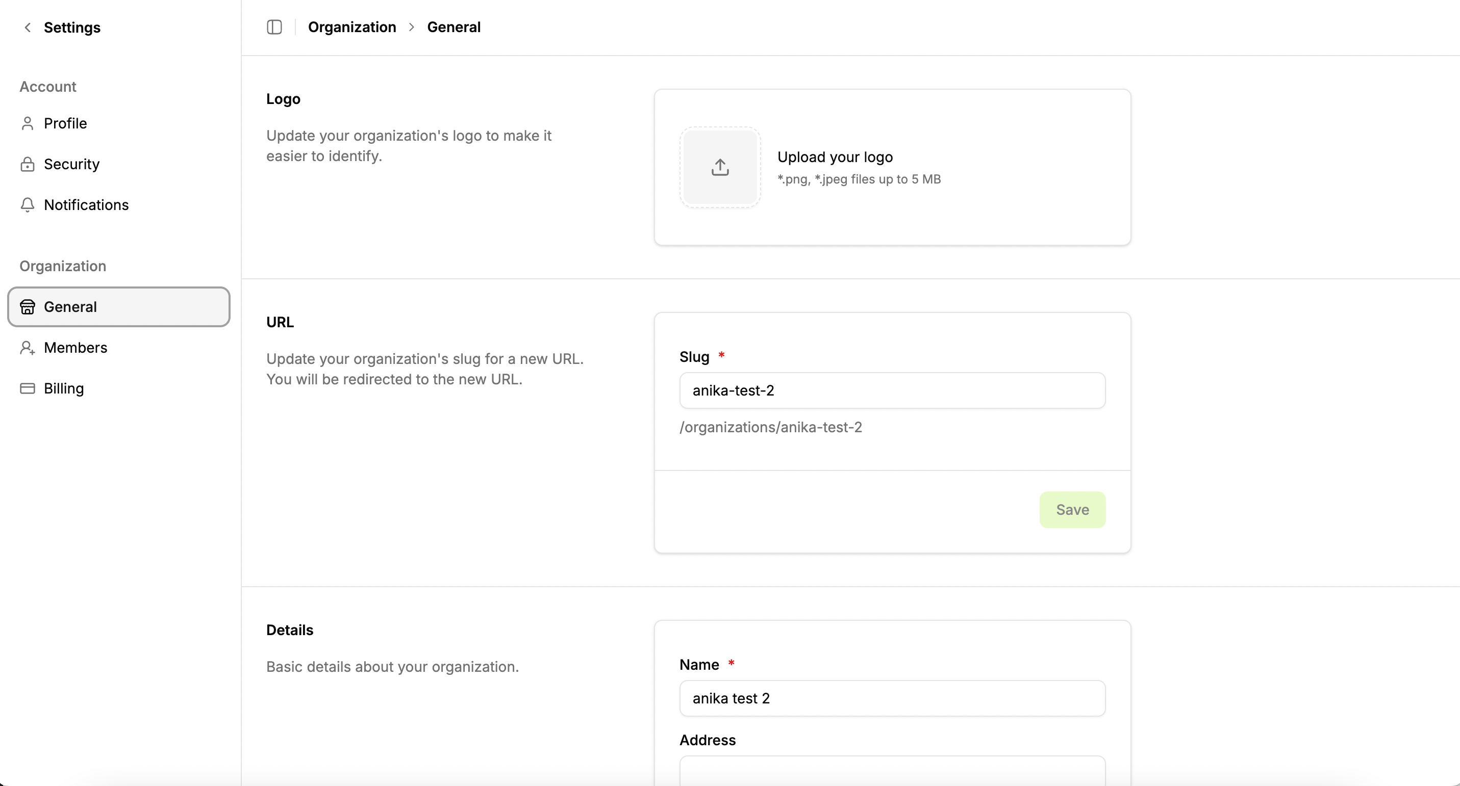In the general account section, you can change your organization’s Logo, view the url used for your organization, and edit organization details.