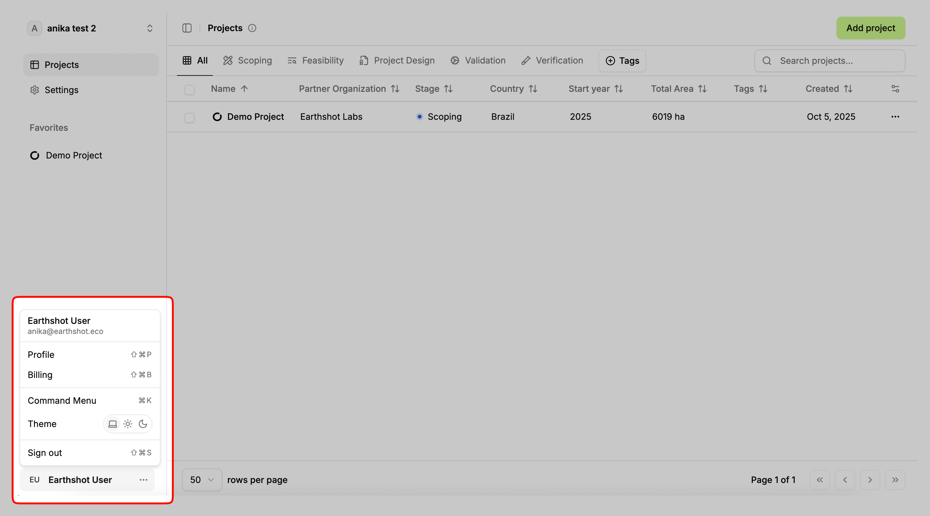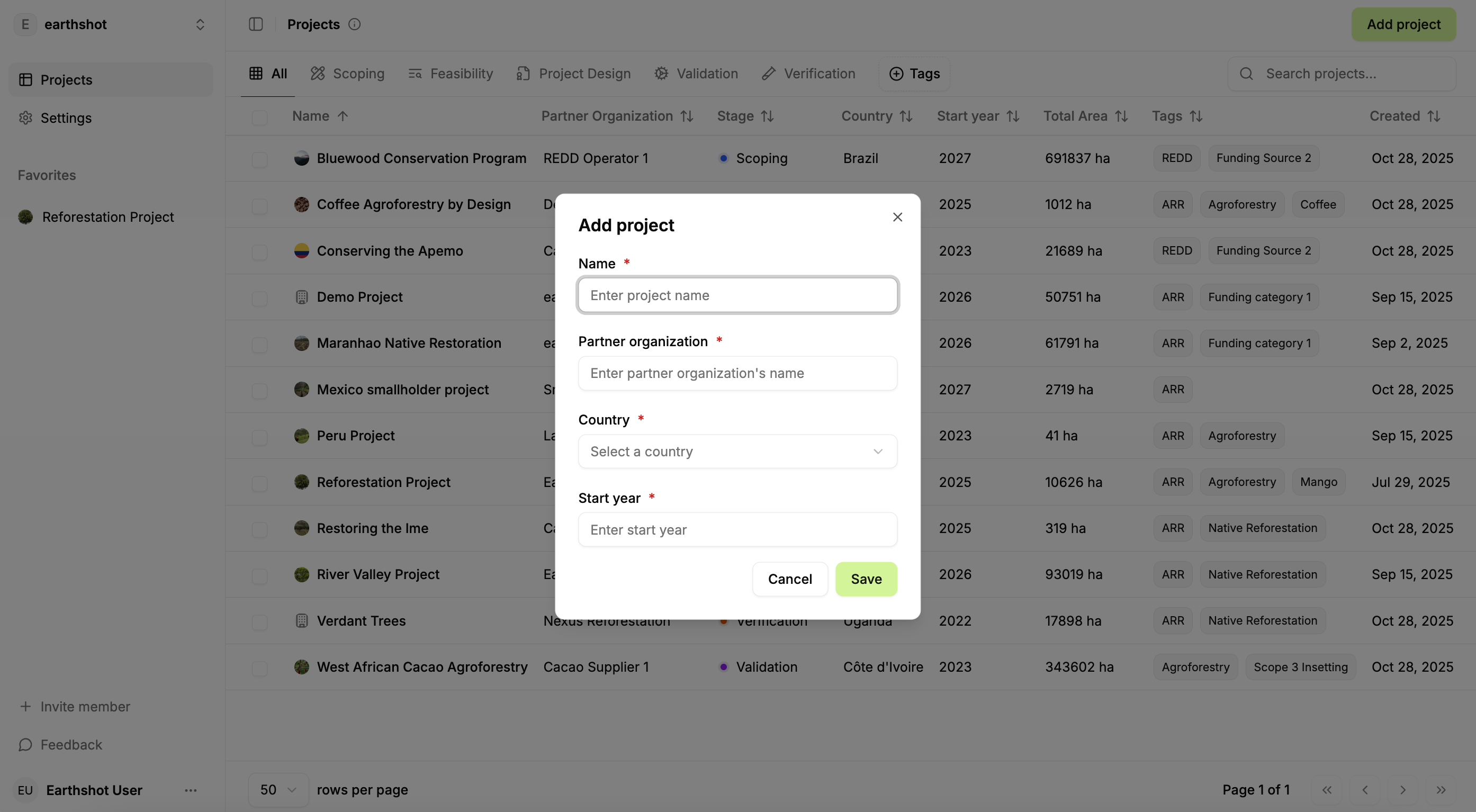After logging in and joining your organization, you land on the Projects Table. This table lists all projects you have created, each representing a coherent set of activities that can include one or many polygons and one or multiple interventions (for example, REDD+, ARR, or a combination).