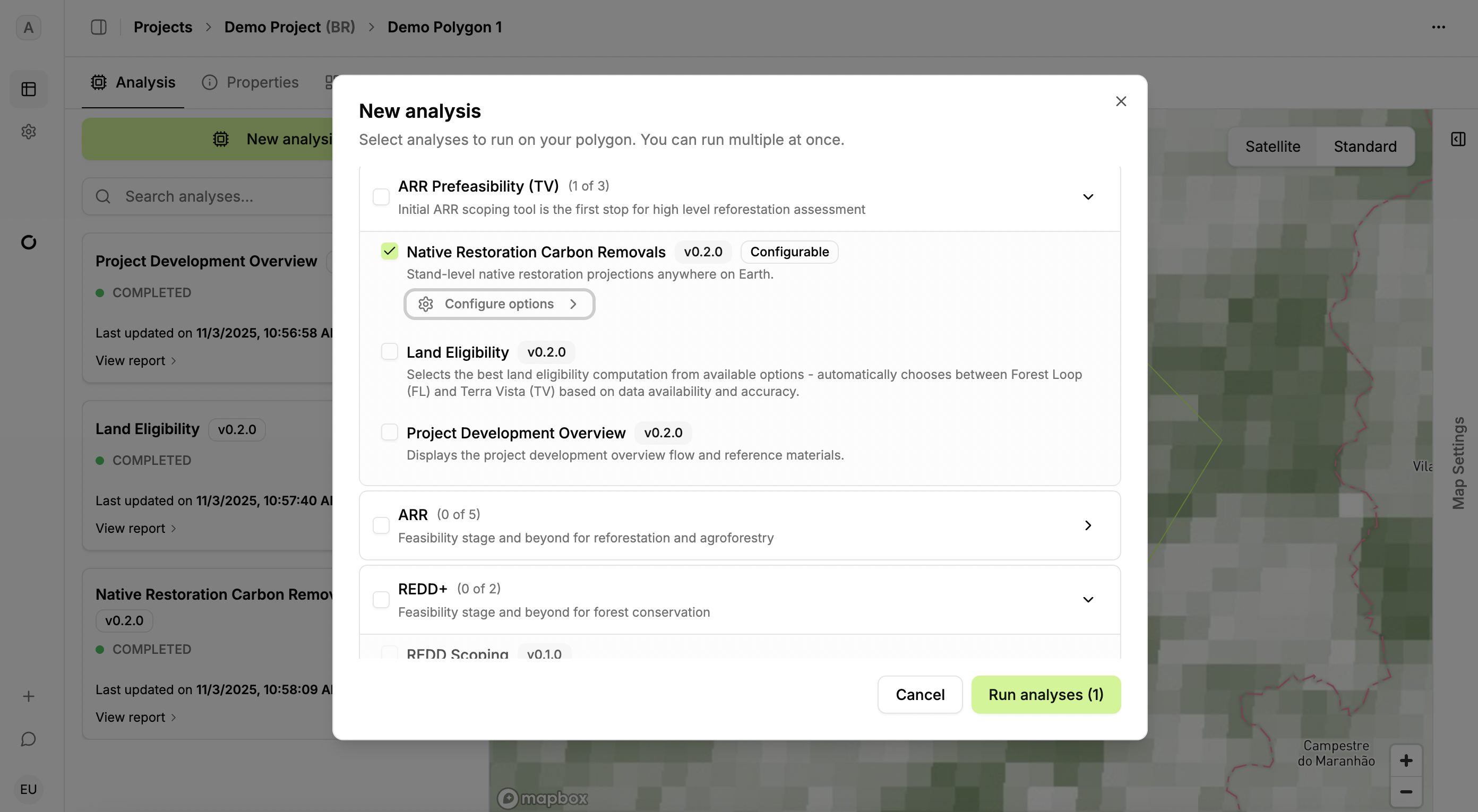 The ARR Prefeasibility (TV) analysis has three components: Native Restoration Carbon Removals, Land Eligibility, and Project Development Overview. The Project Development Overview displays the project development flow and reference materials. The Native Restoration Carbon Removals runs our proprietary growth model developed based on empirical observations of reforestation growth (see documentation section) and provides discount scenarios based on the productivity on the landscape that could lead to leakage. The Land Eligibility computation evaluates carbon project eligibility to confirm that there has not been deforestation in the past 10 years and the project does not convert native ecosystems. The dataset used for this computation depends on the geography of the project (see documentation section).