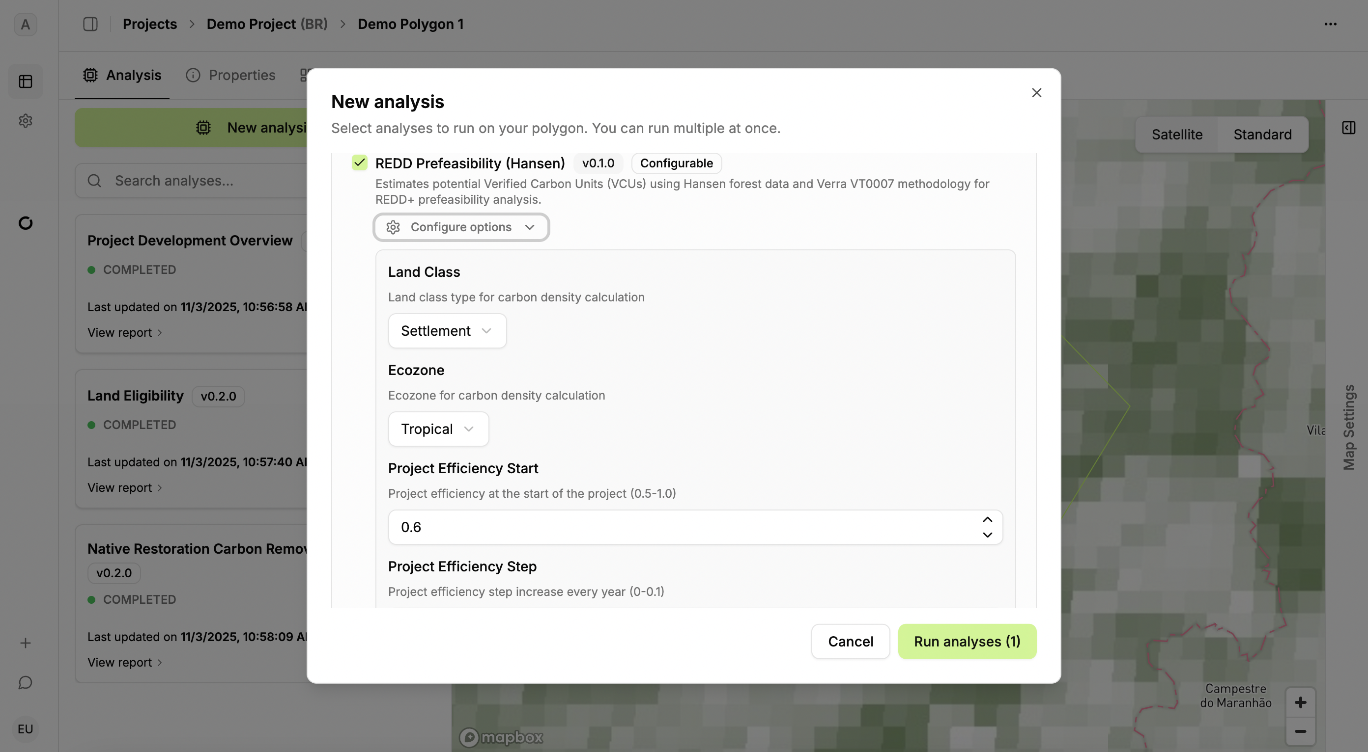 For REDD+ projects, LandOS evaluates projects using the VM0048 framework, Verra activity data if available, or using Earthshot’s own deforestation risk model developed using Hansen data.