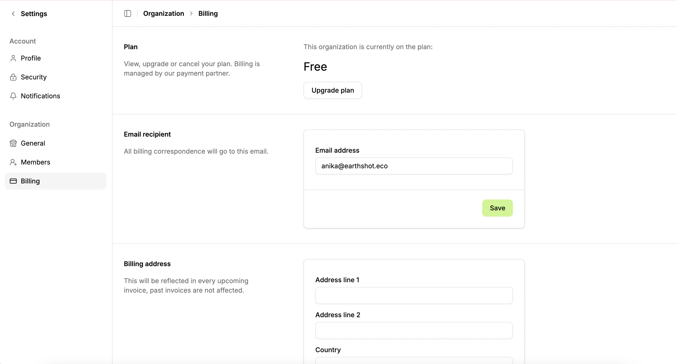 In the members section you can see the members of your organization and send invites to additional team members to join LandOS. Remember that you only need to upgrade to the Starter Tier on one members account and all team members will get access to the upgraded features for seamless collaboration.