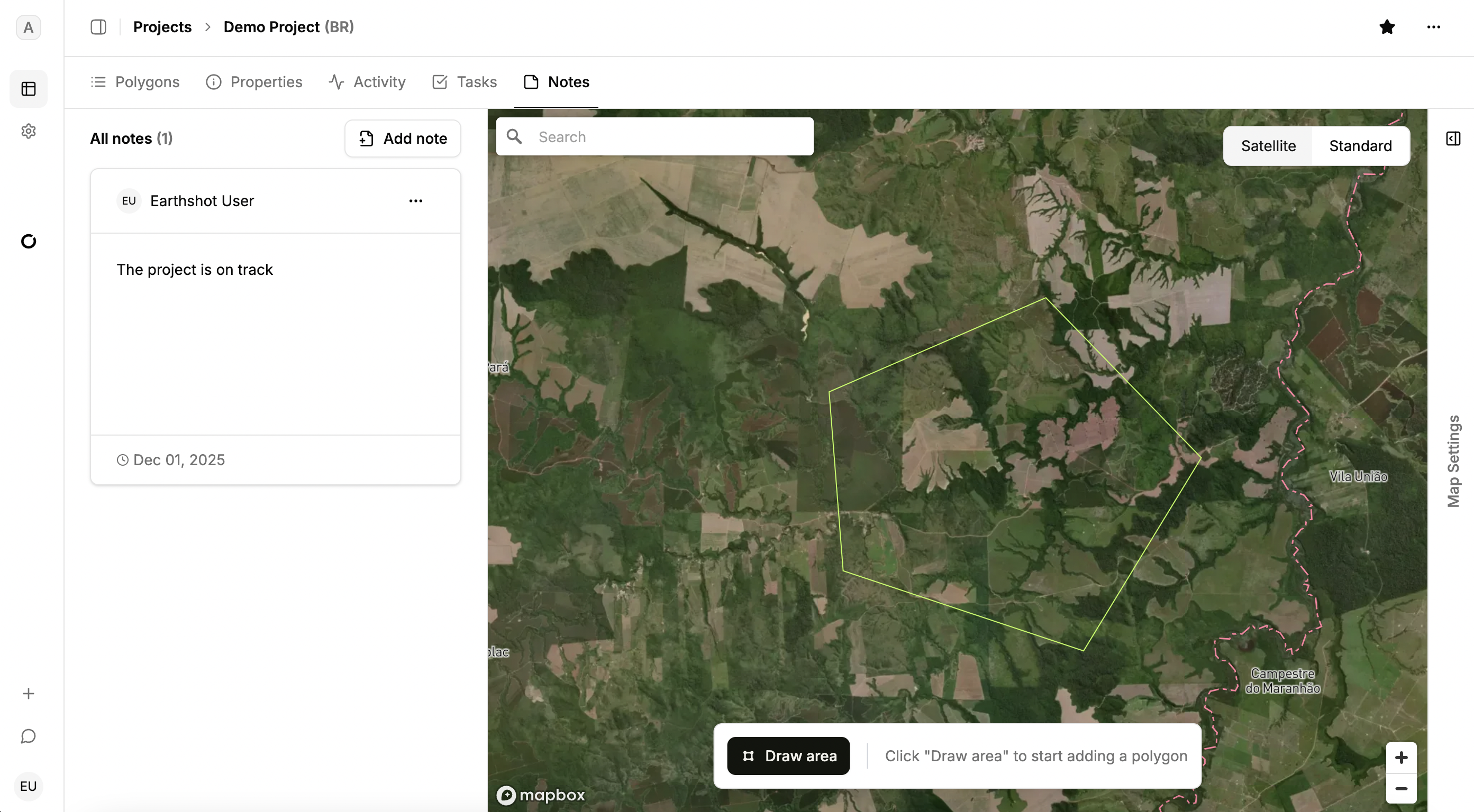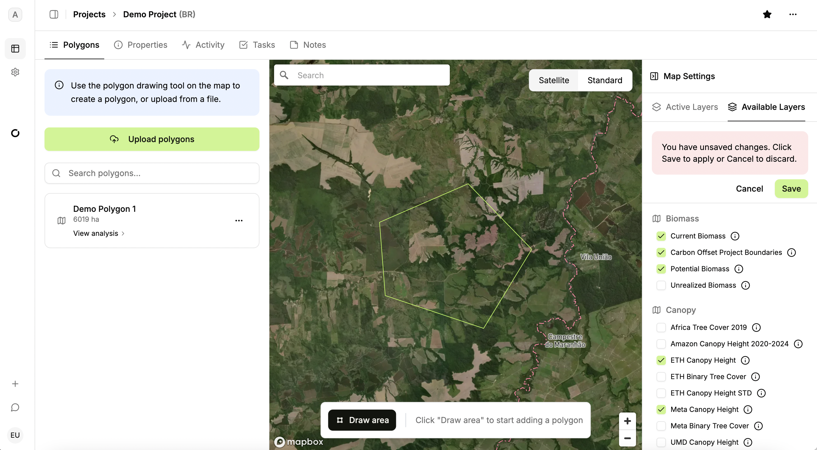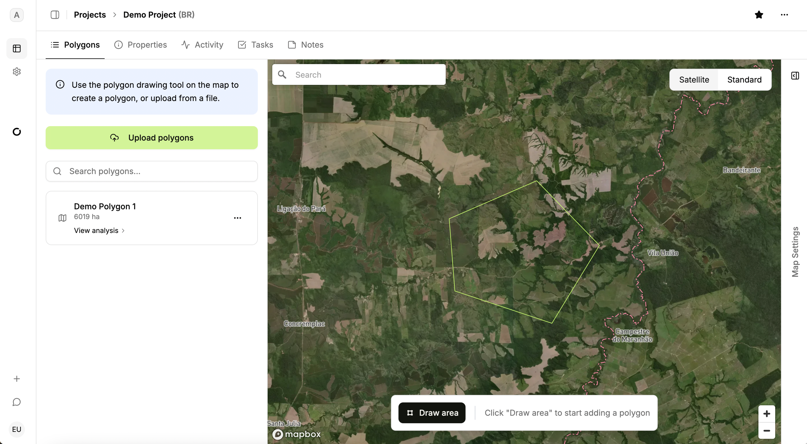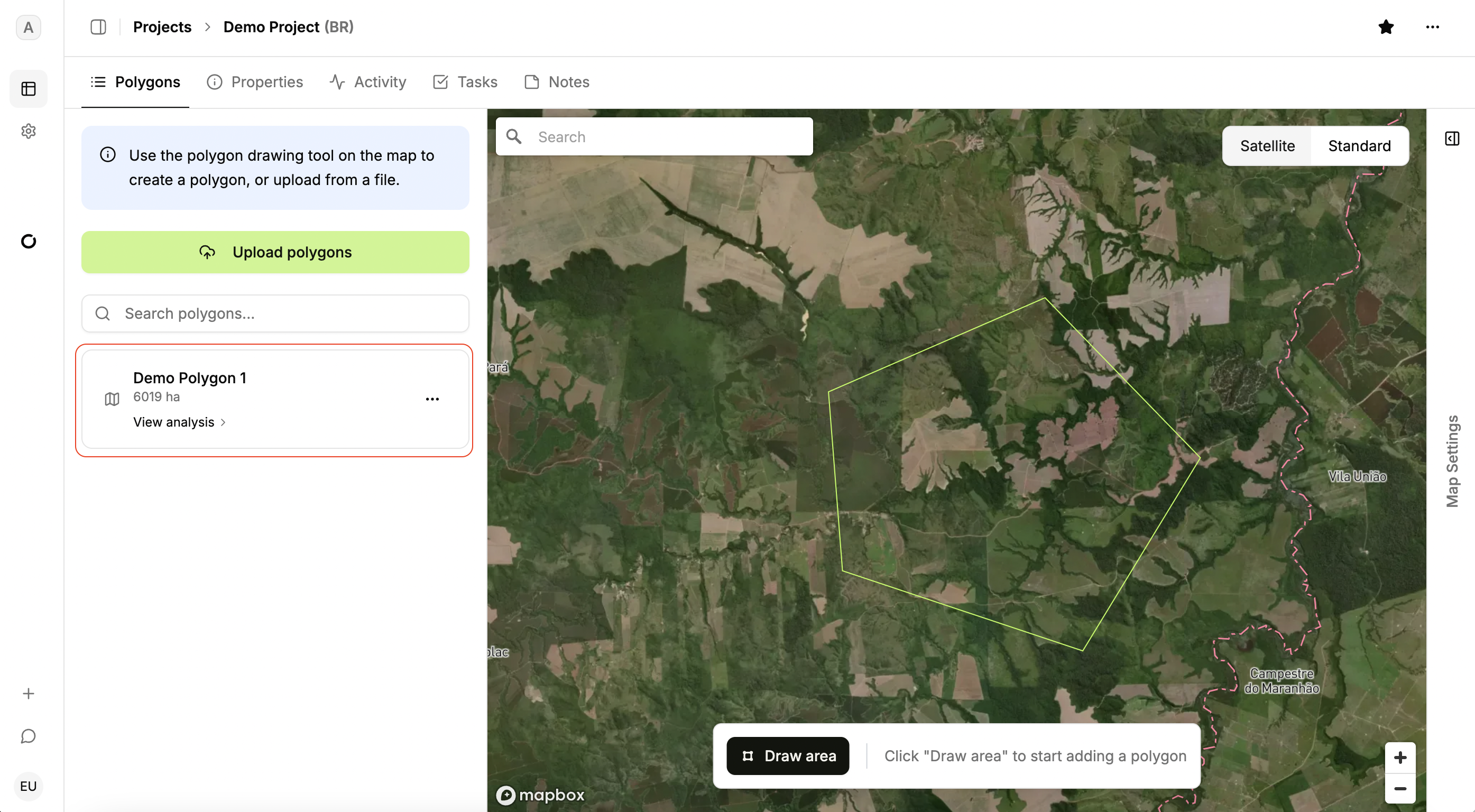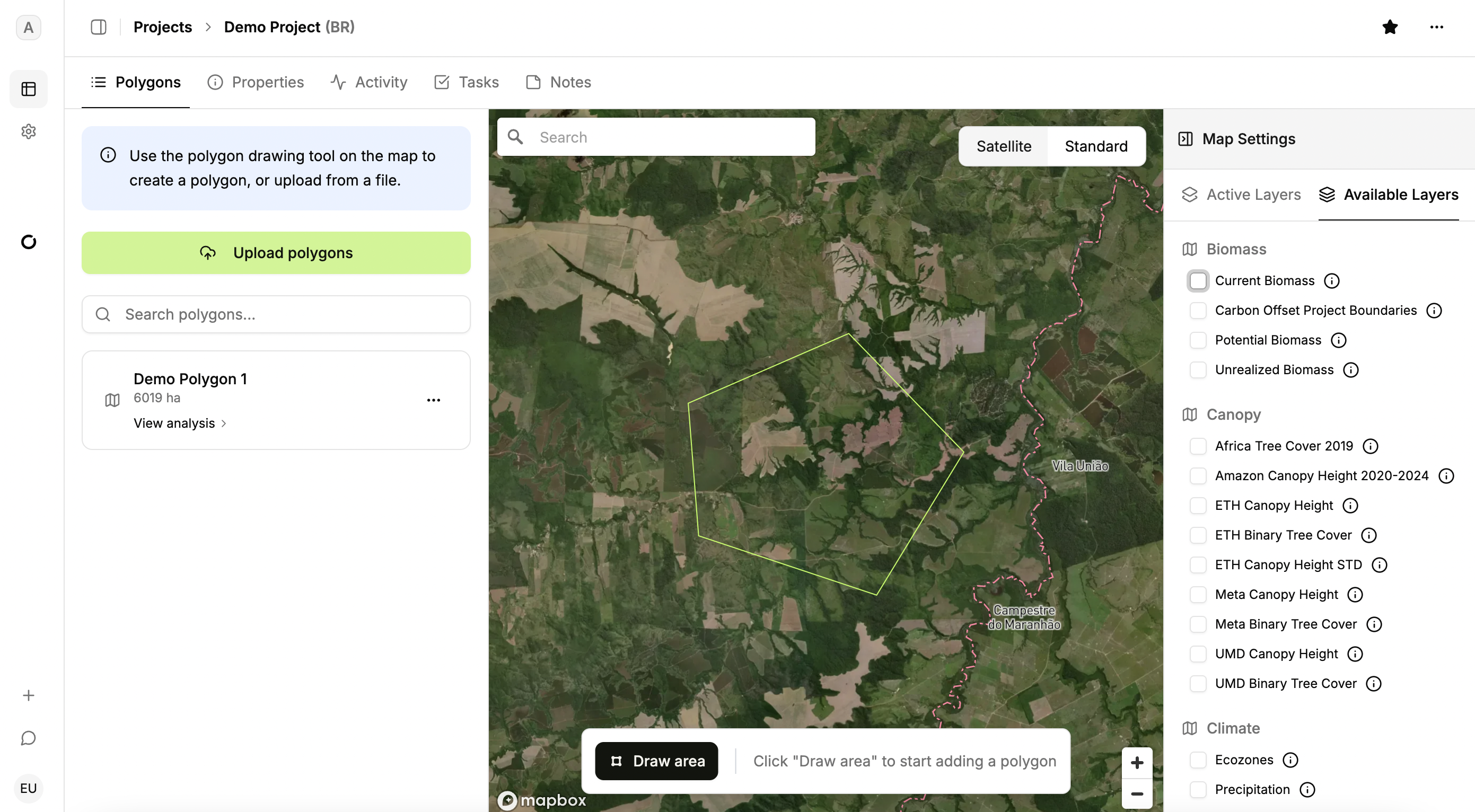 In the Polygons tab, you can add project areas by uploading polygons or drawing them directly on the map. A Project can include multiple polygons, and each polygon appears in the left panel after it is added.