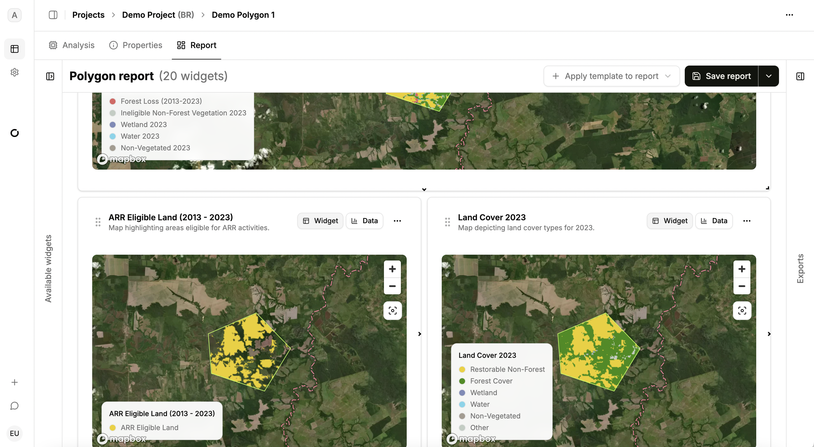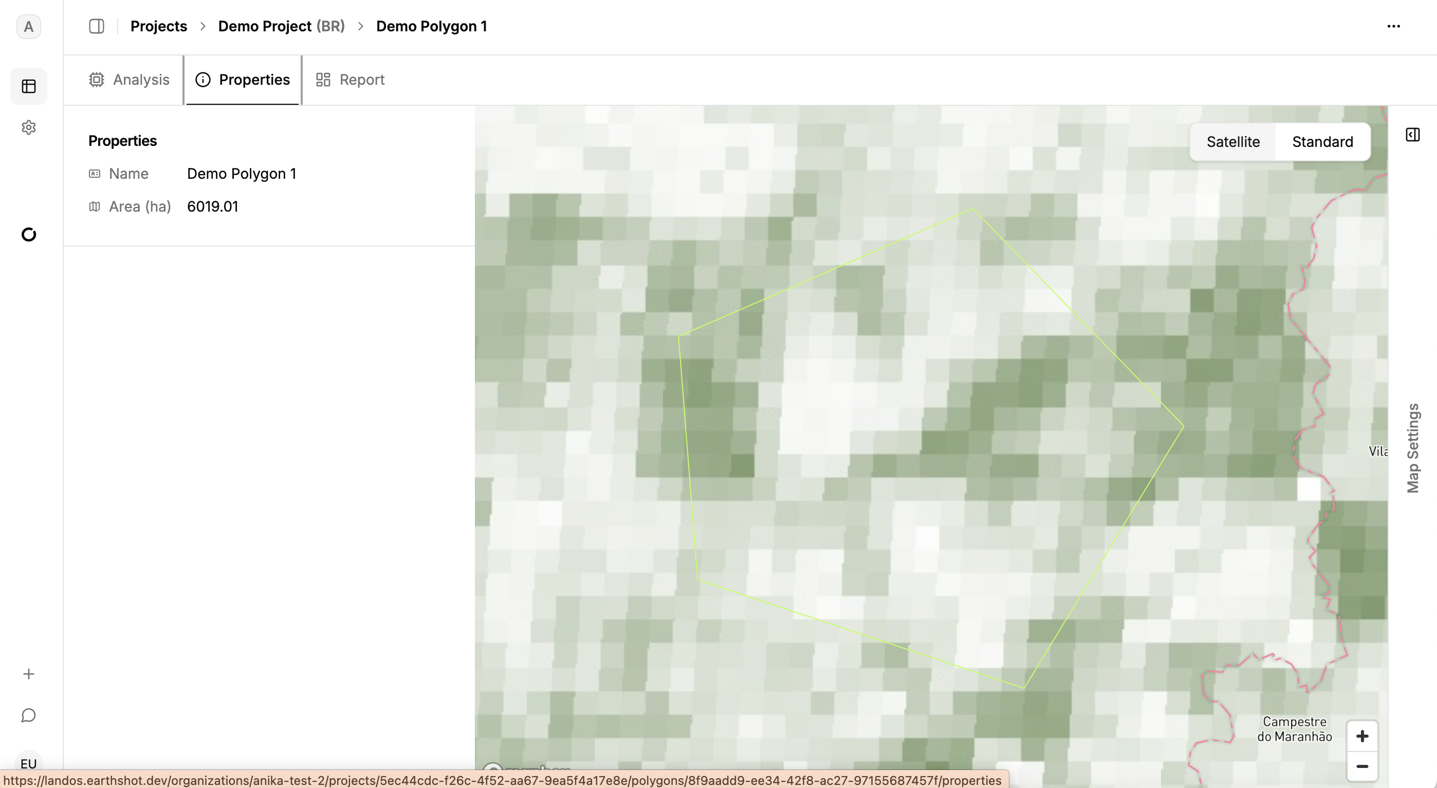 In the Polygon view, tabs for Analysis, Properties, and Report are available. The Properties tab displays details such as name and area.