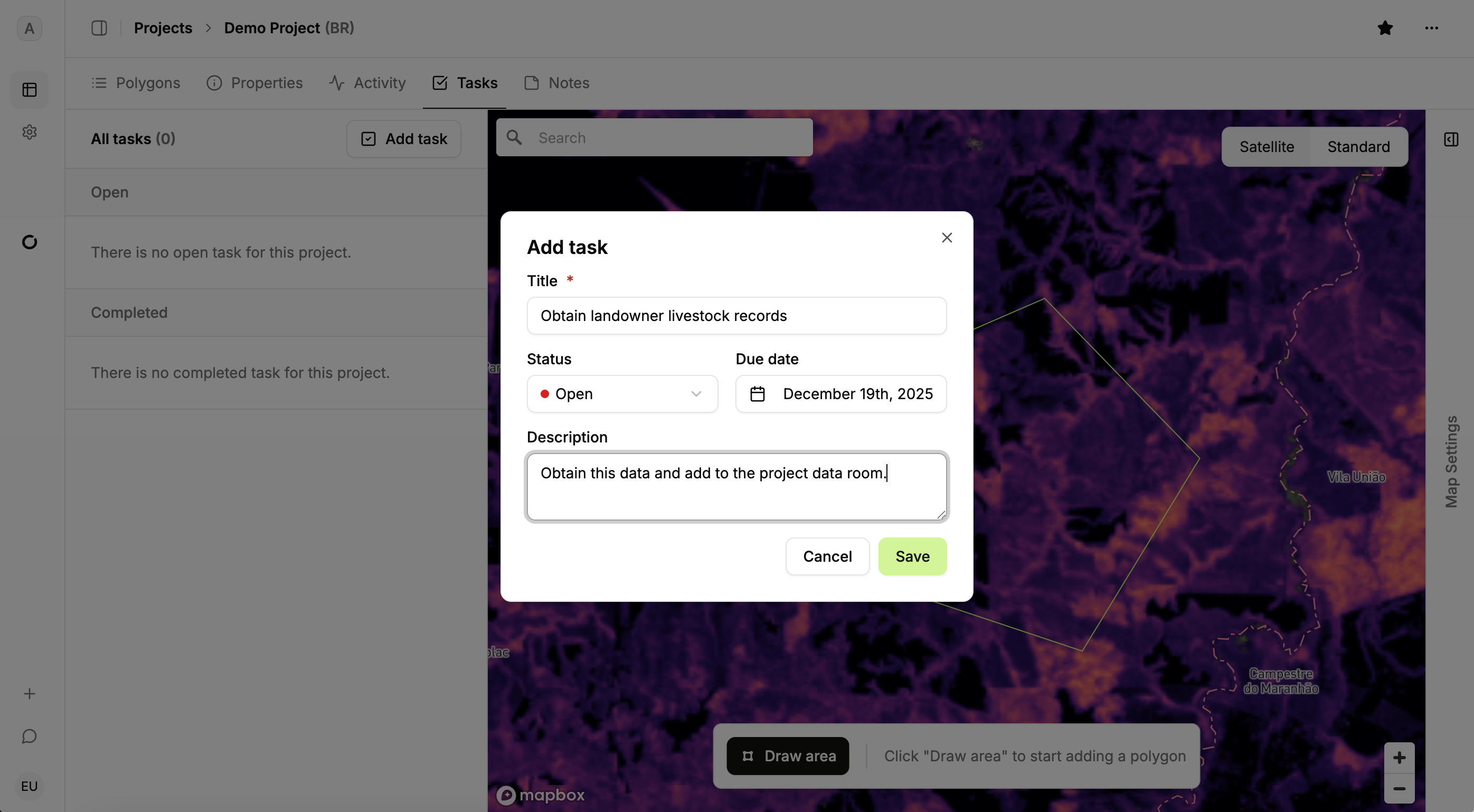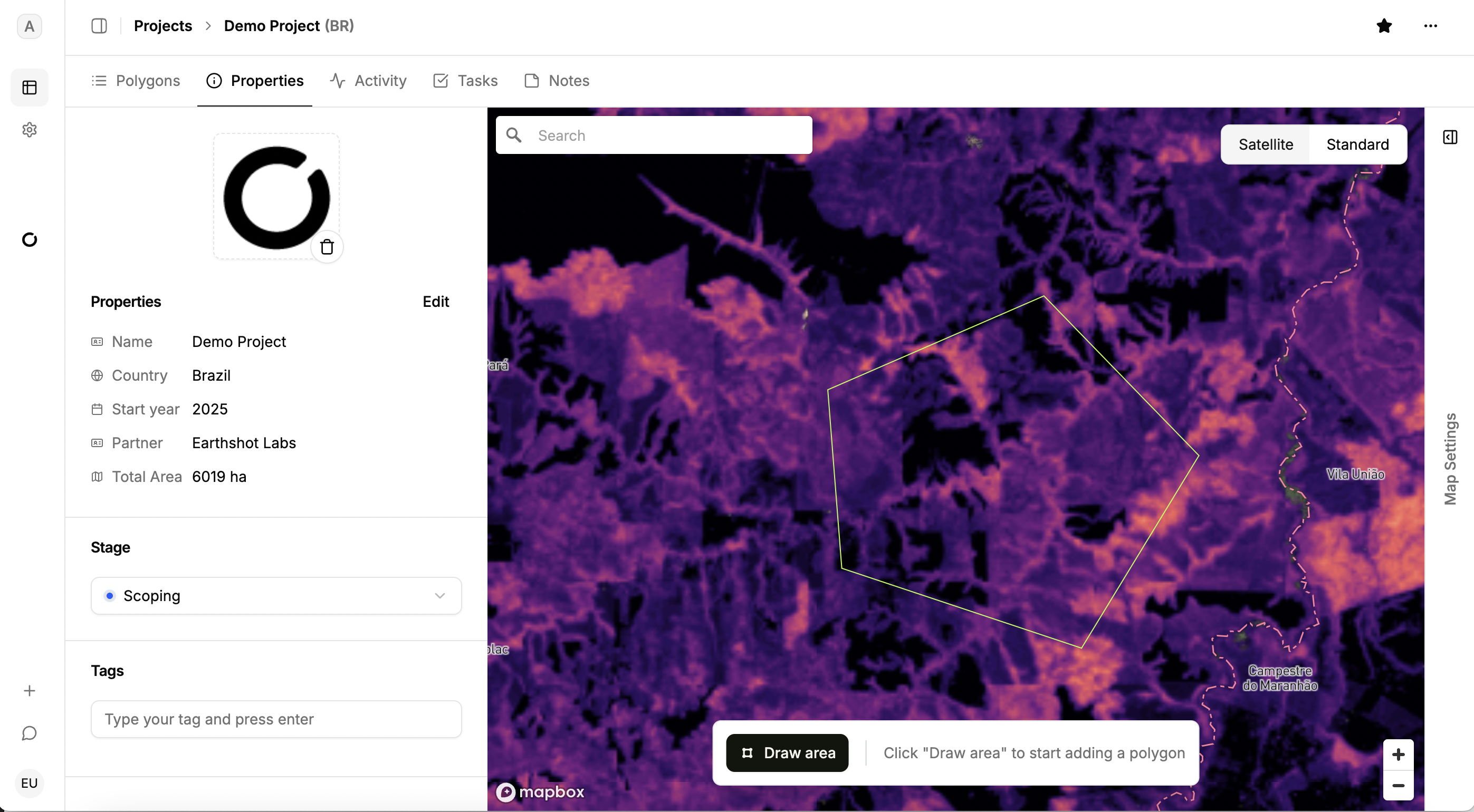 Every Project has Properties. Here you can set an icon to help identify the project the Projects table and edit summary details such as name, country, start year, partner, and total polygon area. You can also update the project stage and manage the custom tags that appear in the Projects table.