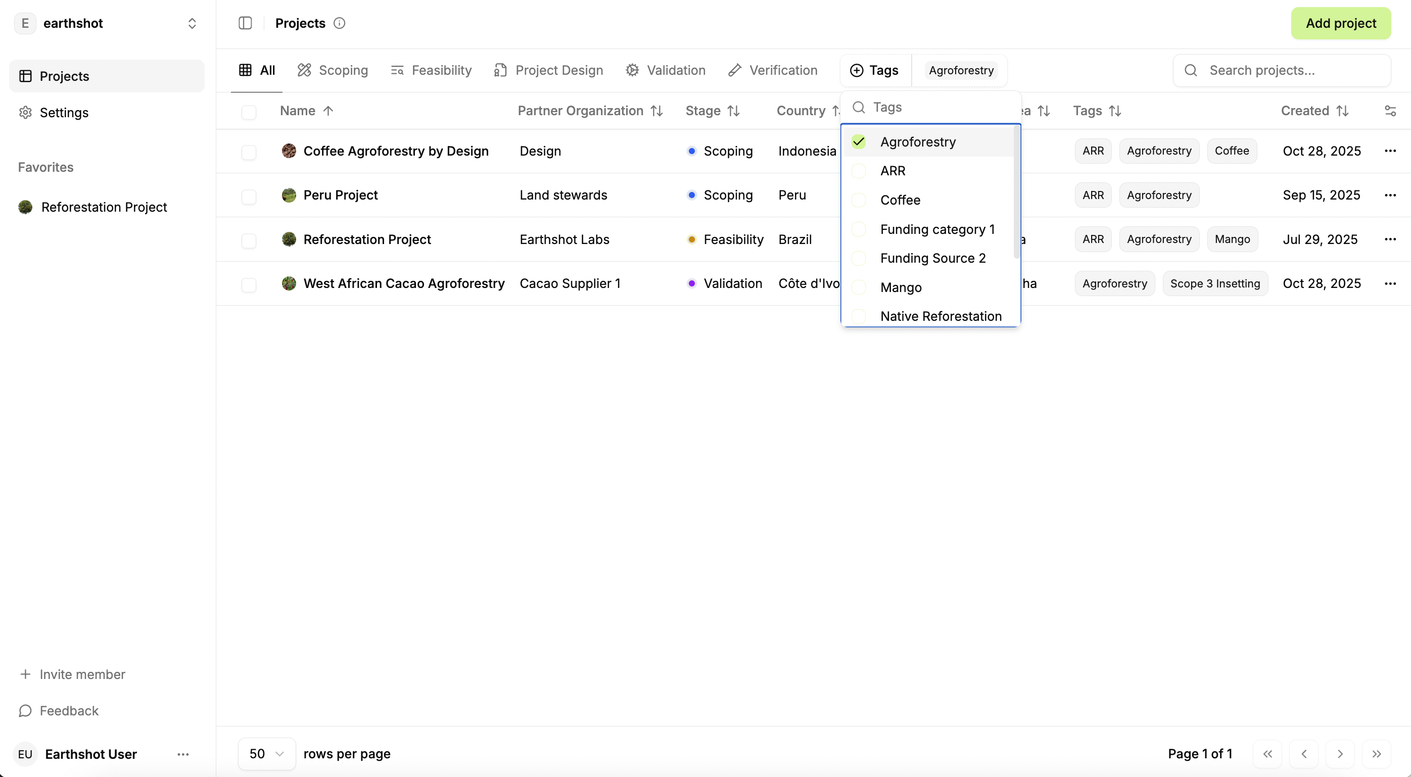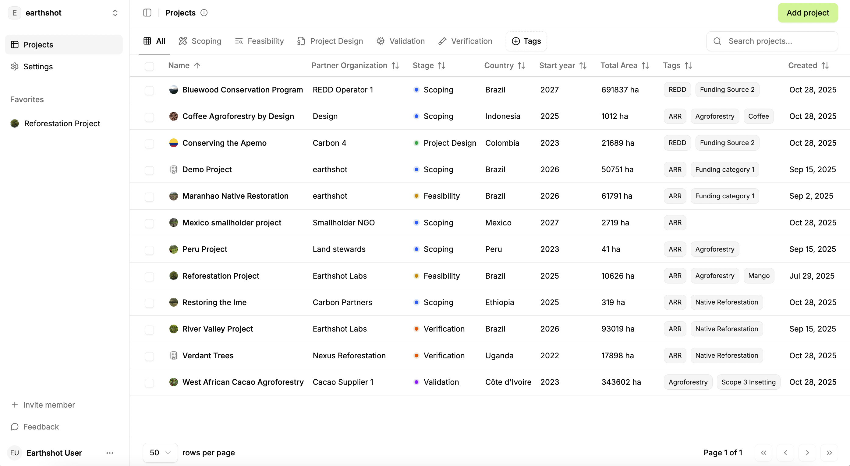 Each row shows key project information, including project stage (scoping, feasibility, project design, validation, verification) and custom tags that help you track project types (e.g. ARR, REDD+, funding source, portfolio group). You can filter the Projects Table using these tags, and you can also see basic details such as total polygon area and creation date.