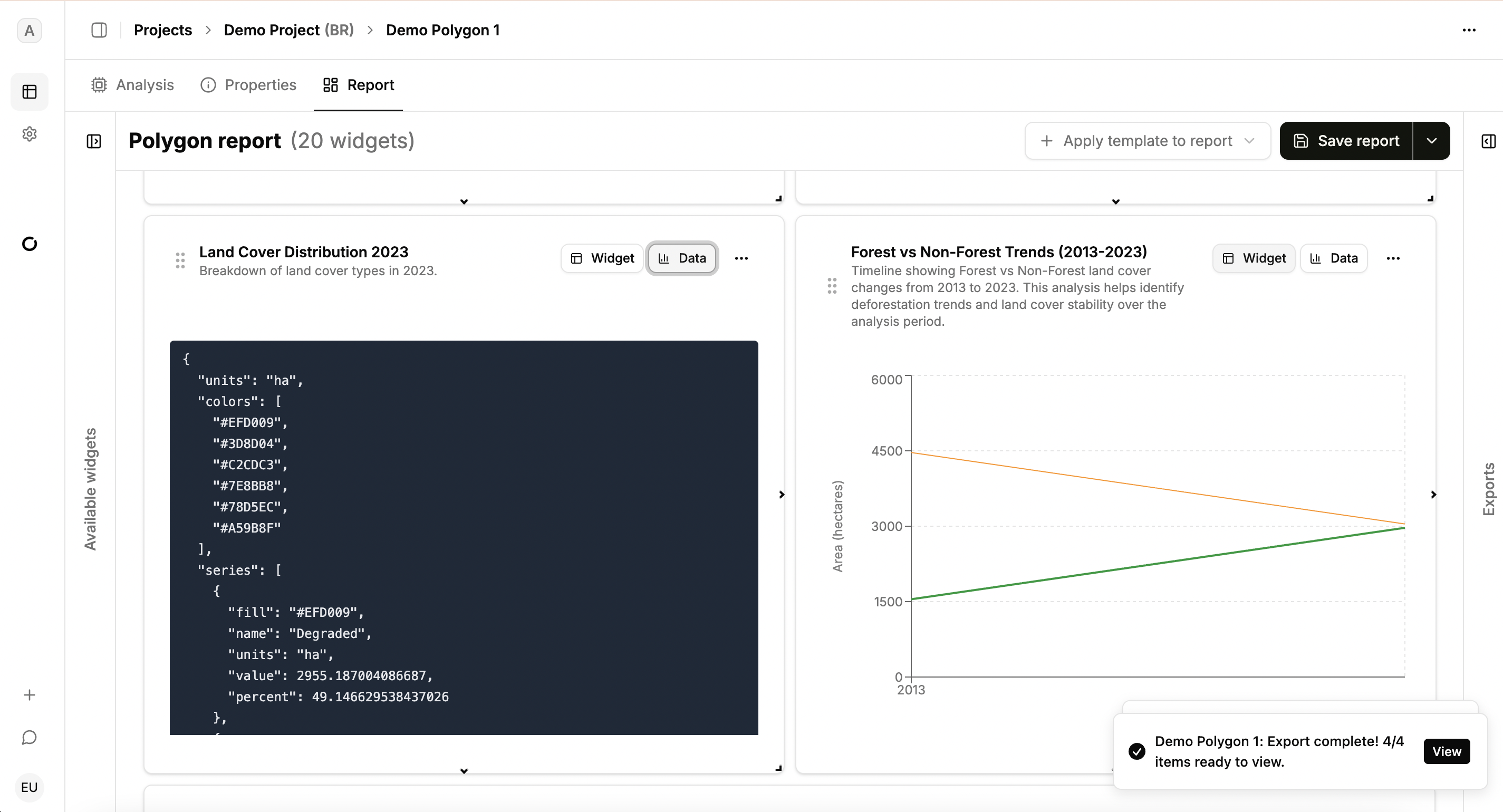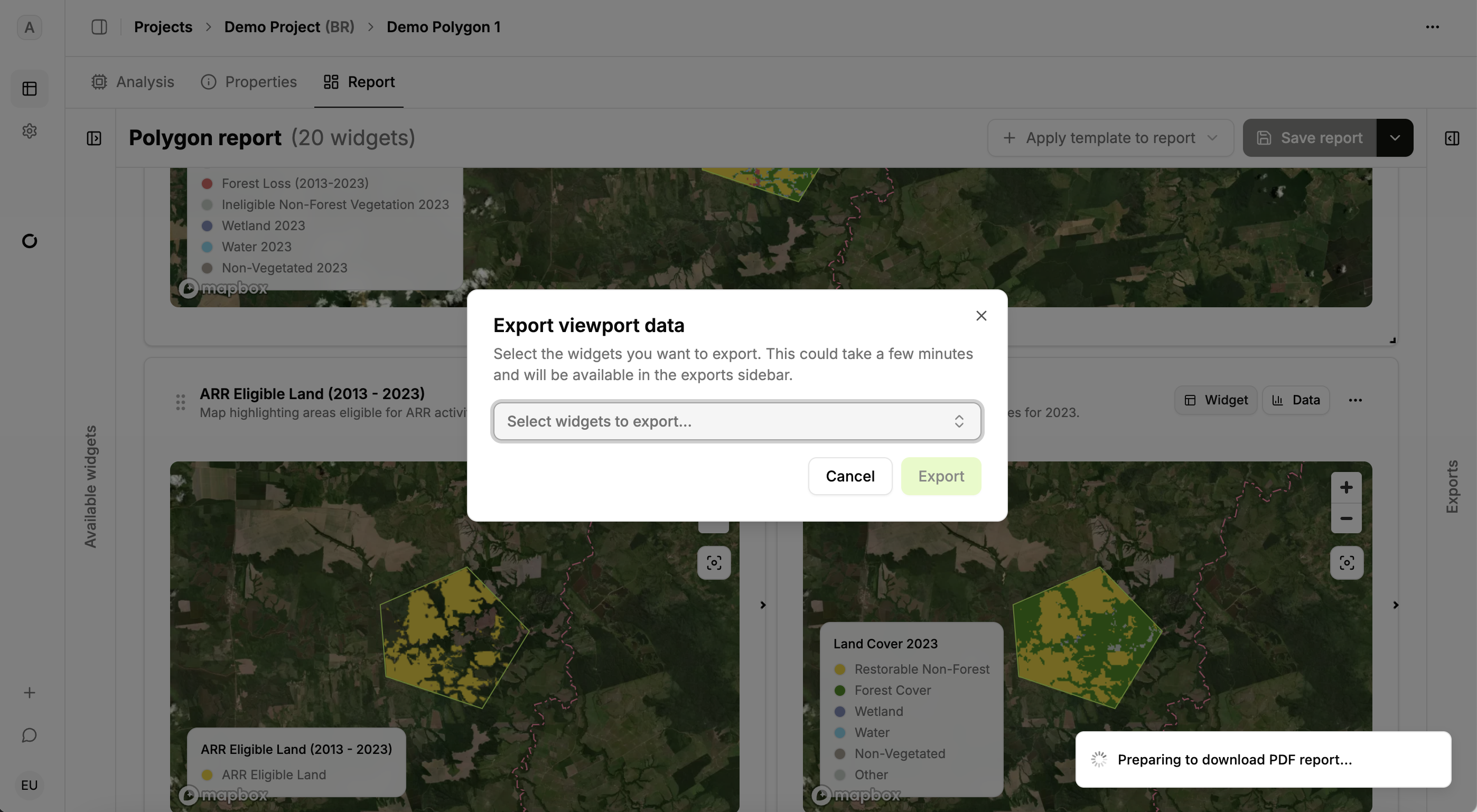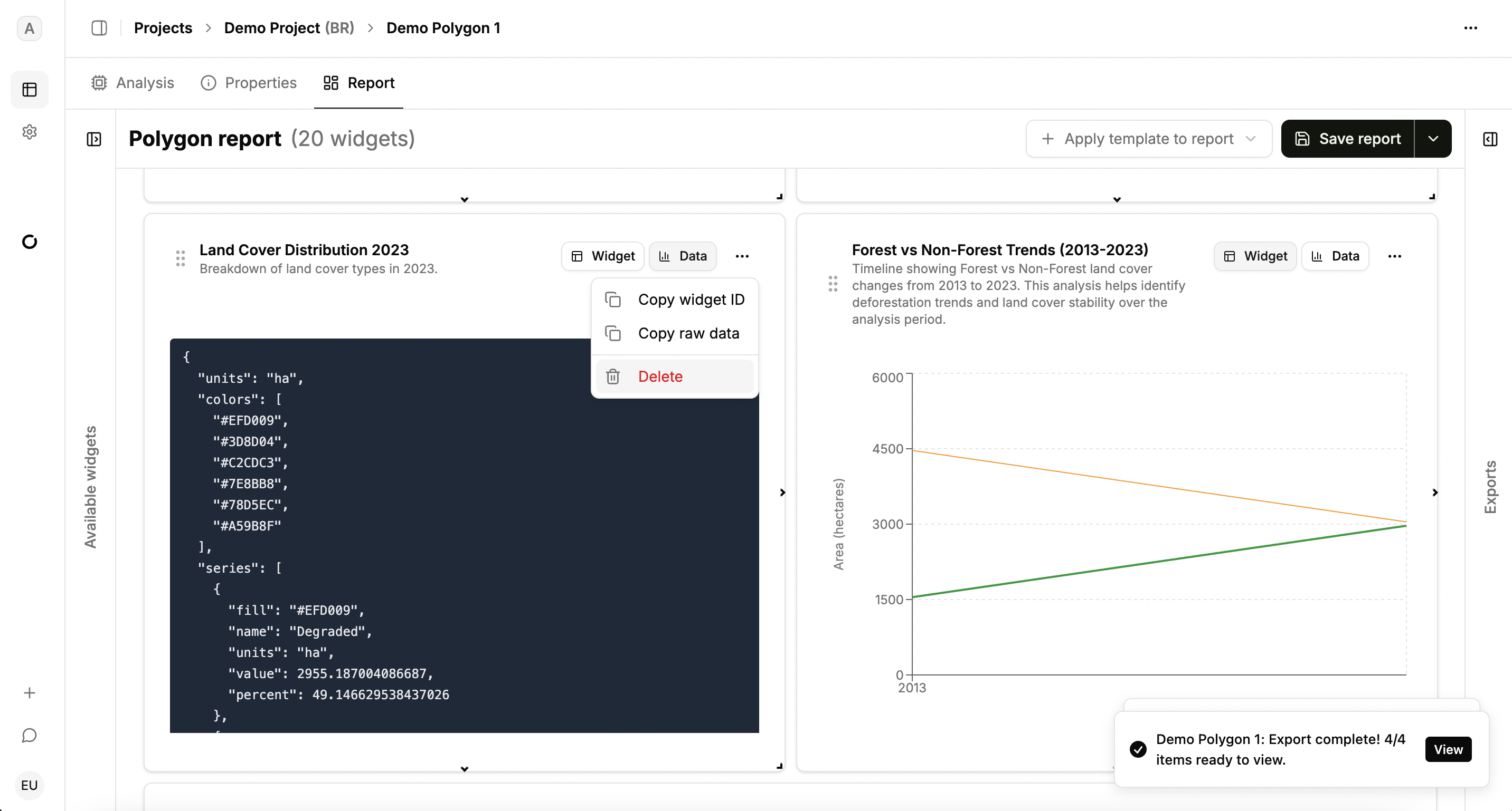 Pick which widgets to export. Downloads are accessed in the export drawer on the right, where you can track export status. Download completed PDF reports for sharing. Export widget data in CSV or PNG formats.
