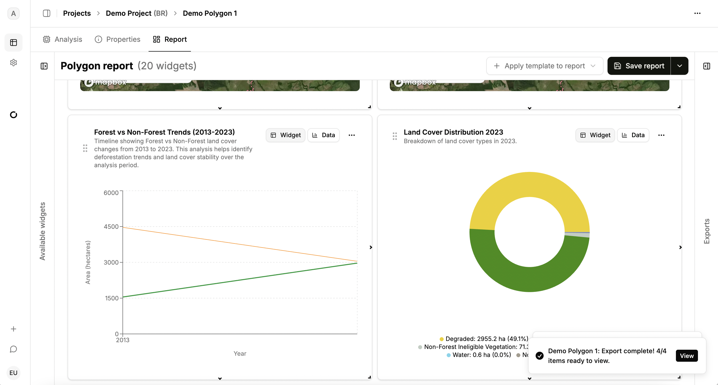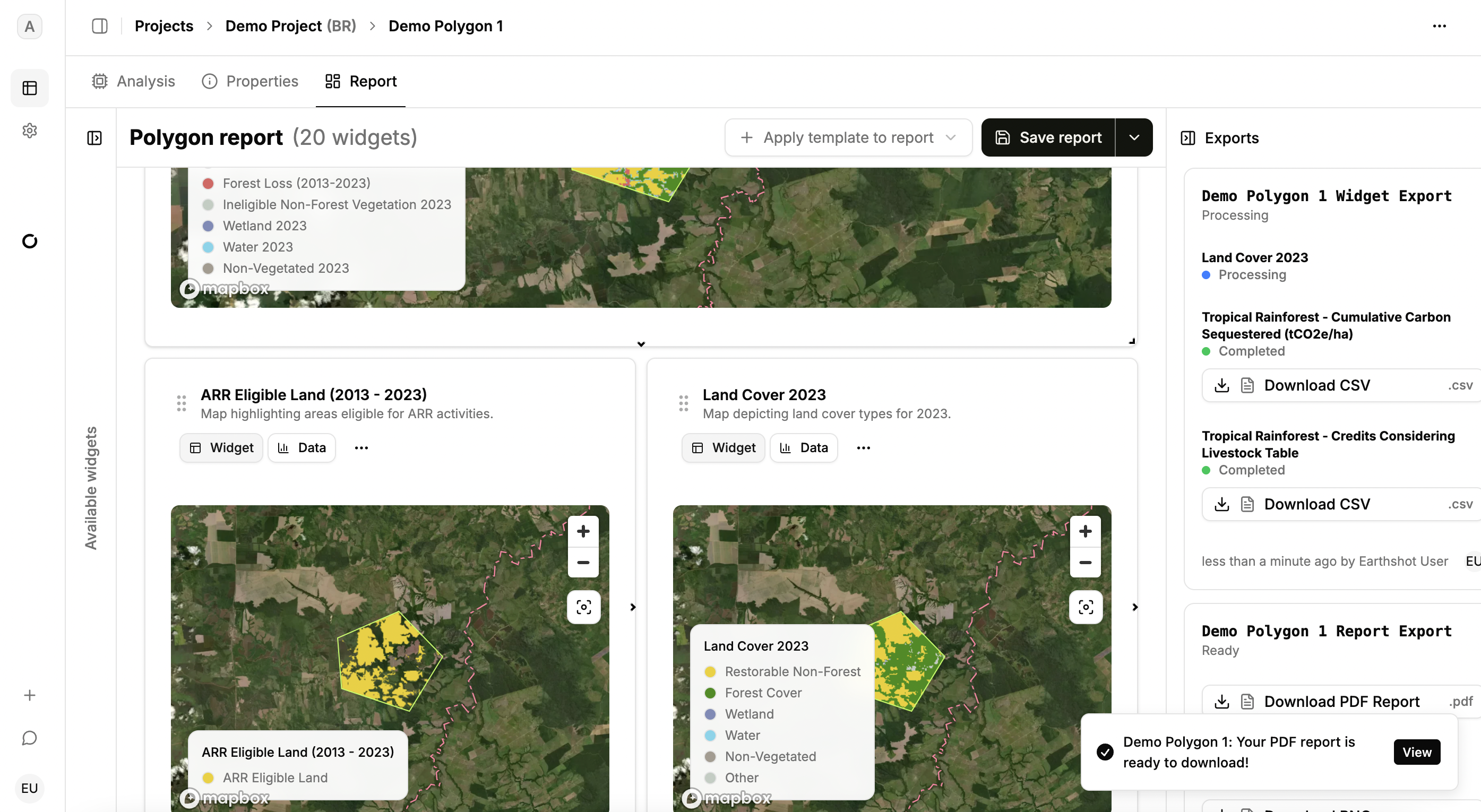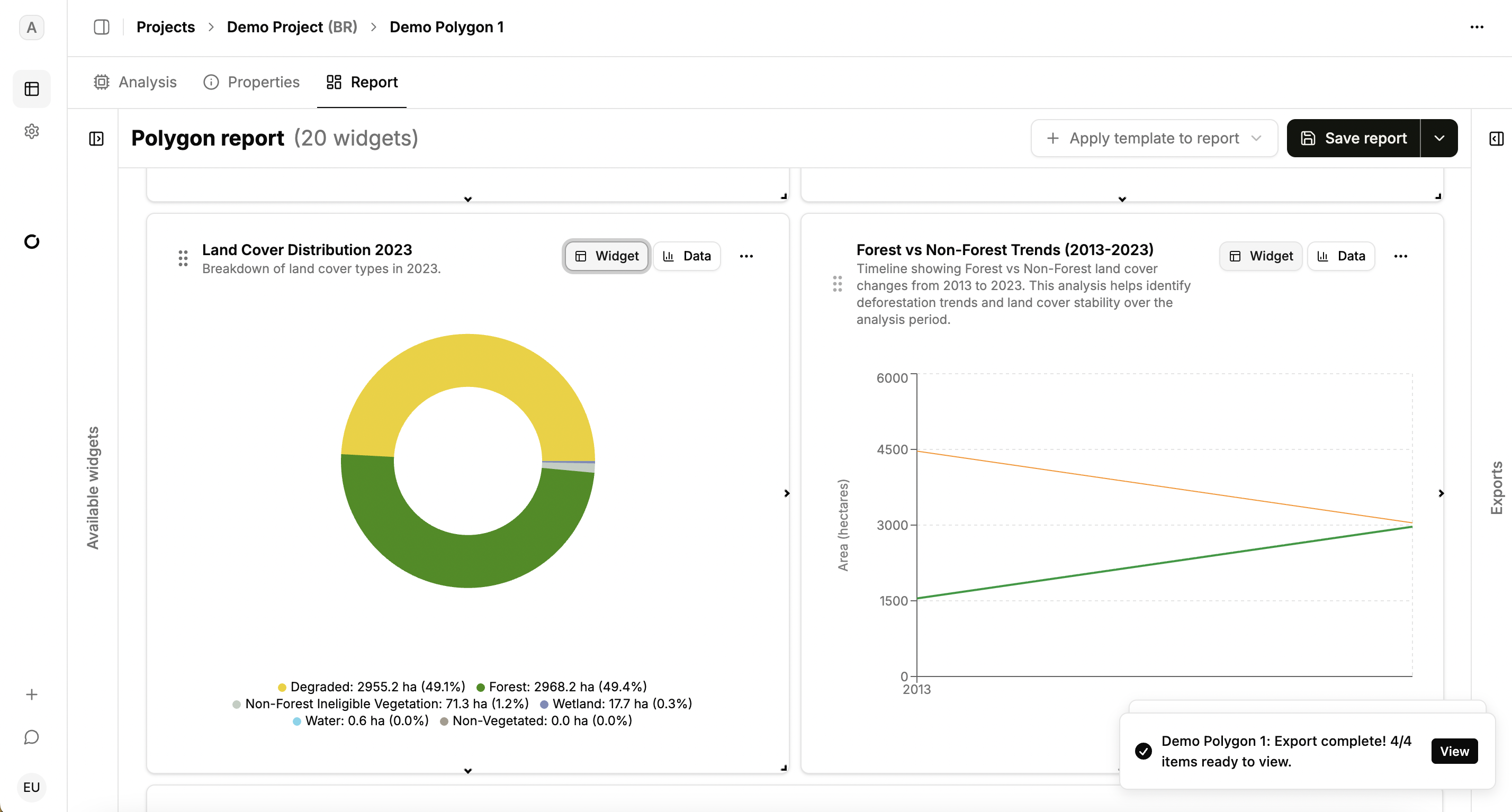 Pick which widgets to export. Downloads are accessed in the export drawer on the right, where you can track export status. Download completed PDF reports for sharing. Export widget data in CSV or PNG formats.