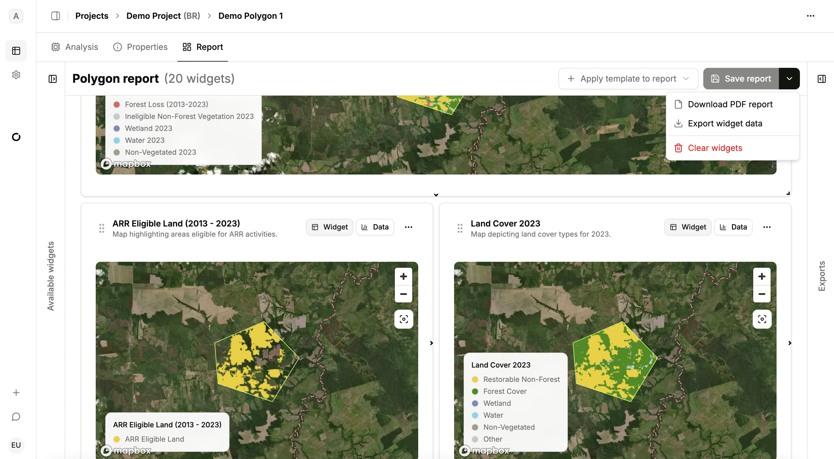Starter Tier users can export PDF reports and widget data. After saving a report, use the export dropdown.